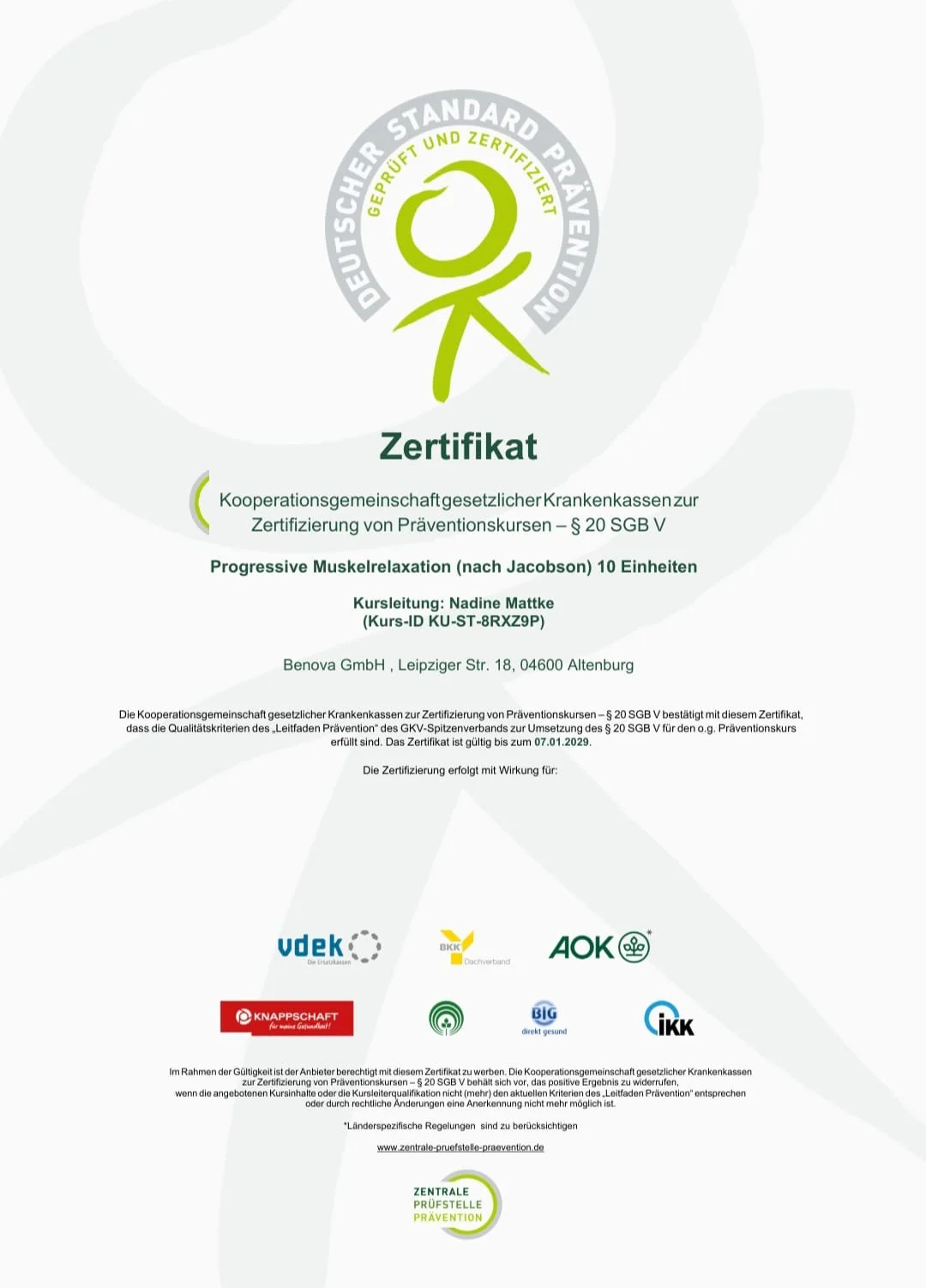 Nach Abschluss eines zertifizierten Kurses erhalten Sie eine Teilnahmebescheinigung, die bei der Krankenkasse eingereicht werden kann.
